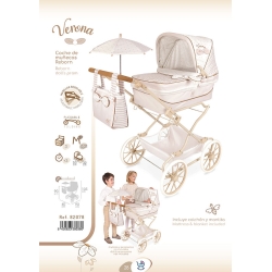 Le pack comprend : poussette de poupées reborn de couleur blanche et beige avec imprimé spécial de la ligne Verona, structure pliable, ombrelle assortie, plateau inférieur porte-objets, grandes roues de style classique avec revêtement en caoutchouc silencieux, poignée rembourrée, nacelle rigide, capote avec tendeurs, sac assorti pour la poussette et plus de détails de luxe.