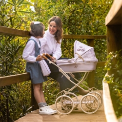 Le pack comprend : Poussette de poupées de couleur blanche et beige avec imprimé spécial de la gamme Verona, structure pliable, plateau inférieur porte-objets, grandes roues de style classique recouvertes de caoutchouc silencieux, poignée rembourrée, nacelle rigide, capote avec tendeurs, sac assorti pour la poussette et plus de détails de luxe.