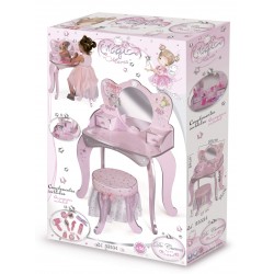 Le kit est composé de: Commode pour Poupées en Bois de la collection Magic María avec tabouret rembourré, miroir pour enfants, deux tiroirs, sèche-cheveux, fer à lisser, miroir de poche, peigne, parfum, rouge à lèvres et beaucoup plus d'accessoires.