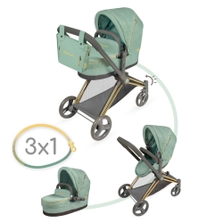 Comprend : 1 poussette de poupées Capriccio de couleur verte et noire avec design 3 en 1 convertible en chaise et nacelle, structure pliable, roues avant giratoires, ceinture de sécurité de style harnais, plateau inférieur porte-objets, toile renforcée et lisse combinée, partie de la structure chromée, sac assorti et plus de détails de luxe.