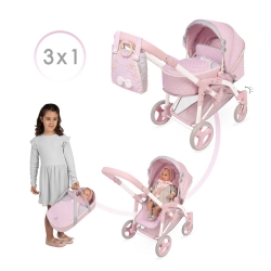 Comprend : 1 poussette de poupées 3 en 1 de la gamme Sophie de couleur rose avec des détails blancs et gris, convertible en poussette de promenade ou nacelle porte bébés avec structure pliable, poignée avec hauteur réglable, roues avant rotatives, tissu renforcé, rubans, détails brodés, boutons décoratifs en bois naturel, roues avec revêtement de mousse, couvre nacelle avec petite poche, sac assorti avec anses en bois naturel, plateau porte objets en tissu assorti.